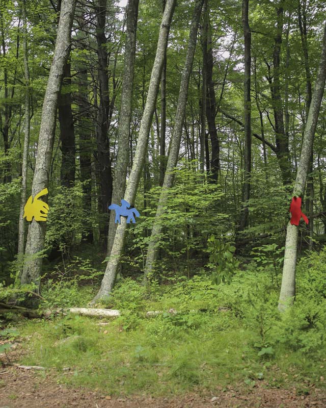 Jane McKenzie Milk paint on plywood $400 each Inquiries: artonthetrails@gmail.com These whimsical red, yellow, and blue monochrome horse shapes pay homage to the pine forest’s history as a horse-riding ring, while also alluding to the art of trail blazes. My intention is to playfully echo the history of Beals Preserve while also honoring the vision of Whitney Beals, who was dedicated to protecting the ecosystem of this land for future generations.