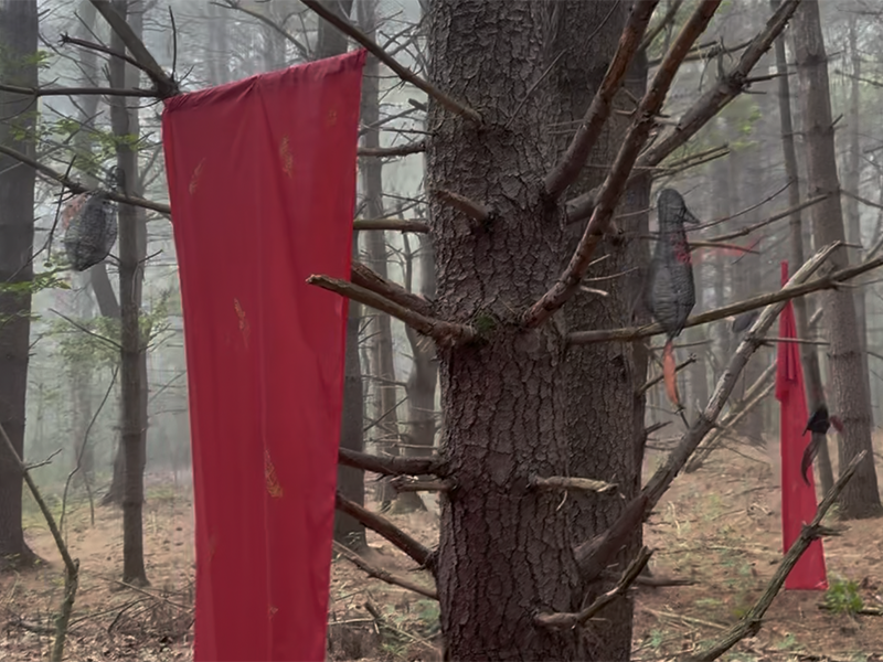 Trish Dehls | Mild steel, vitreous enamel, copper | $2,500 Inquiries: artonthetrails@gmail.com | Nine large micro-welded black birds fly in an open space, in front of hung red fabric panels. Each bird carries a hidden message within. Black birds have been an integral aspect of many cultures and belief systems. Ravens, crows all carry a complex variety of symbolism and meanings. Transformation, wisdom, change are powerful connective themes. The celtic tradition connects a flock of nine ravens with keeping secrets. The color red symbolizes the connection to divine protection and redemption.
