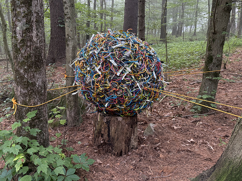 Lisa Barthelson | repurposed sculpture of varied wire, rope, string, mylar and plastic | $3,500 Inquiries: artonthetrails@gmail.com ‘| frenzied returns’ is the rejuvenated sculpture ‘frenzied, resting’, previously installed at the inaugural ‘Art on the Trails’ nine years ago. This chaotic wire orb is a testament to the longevity and durability of what was initially considered temporary art. Its enduring presence is a reminder that what we make or consume can be everlasting, slow or unable to decompose and become one with nature. With some renewed sparkle and pops of color ‘frenzied returns’, ready to party on!