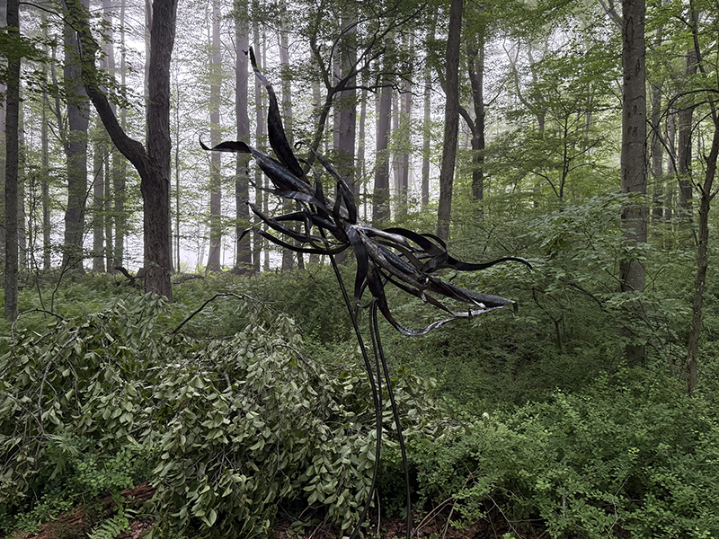 Sarah Alexander | Hand-hammered, welded steel | $9,000 Inquiries: artonthetrails@gmail.com | This piece is inspired by Spring Morning by AA Milne. My mother used to read it to me. Now that I’m older I can truly appreciate the wisdom in those words. Mom has dementia now, and reading the poems of my childhood brings me comfort. The third stanza focuses on shadows reflected in the grass, which my sculpture was designed to do, casting moving shadows like waning memories. After suffering a debilitating fall last year, uncertainty haunts me as I navigate a new normal. Where am I going? I don’t Quite know.